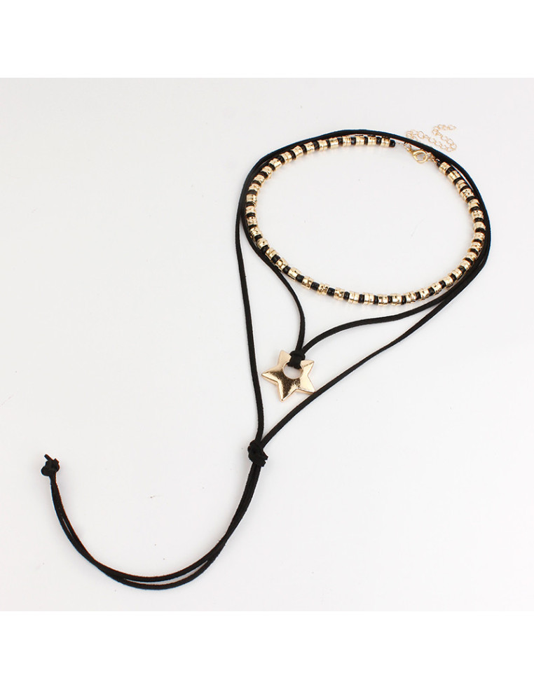 Set de dos collares, uno flexible de lenga enhebrada con mostacillas y piezas separadores de CCB, otro de gamuza de múltiples vueltas con dije exclusivo de fundición.