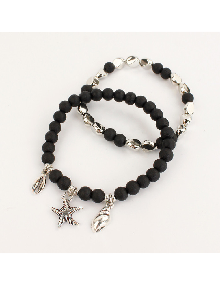 Set de dos pulseras elásticas de cuentas simil roca volcánica combinadas con separadores de CCB orgánicos y dijes marinos de fundición.