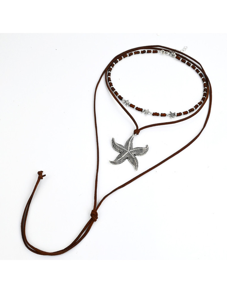 Set de dos collares, uno flexible de lenga enhebrado con mostacillas, piezas pasantes de CCB y dijes marinos de fundición, otro de gamuza de múltiples vueltas y dije exclusivo de fundición.