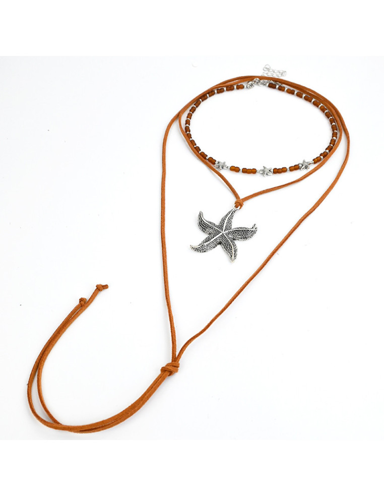 Set de dos collares, uno flexible de lenga enhebrado con mostacillas, piezas pasantes de CCB y dijes marinos de fundición, otro de gamuza de múltiples vueltas y dije exclusivo de fundición.