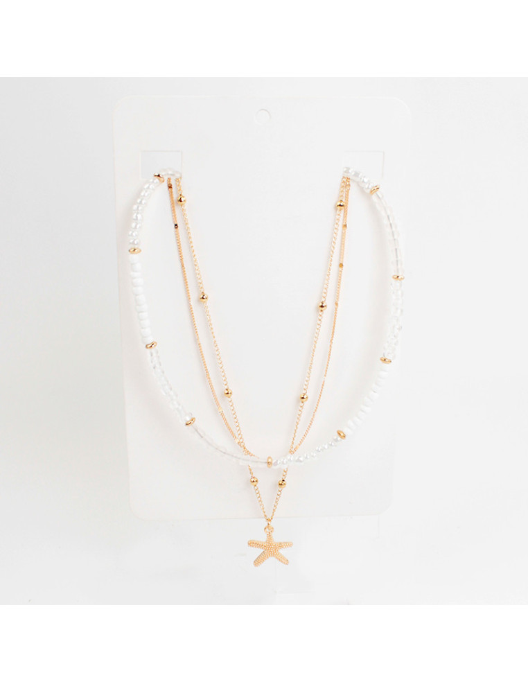 Set de dos collares, uno flexble de lenga enhebrado con distintos tipos de mostacillas diferenciadas, otro de doble caída de cadenas diferenciadas con dije exclusivo de fundición con forma de estrella de mar.