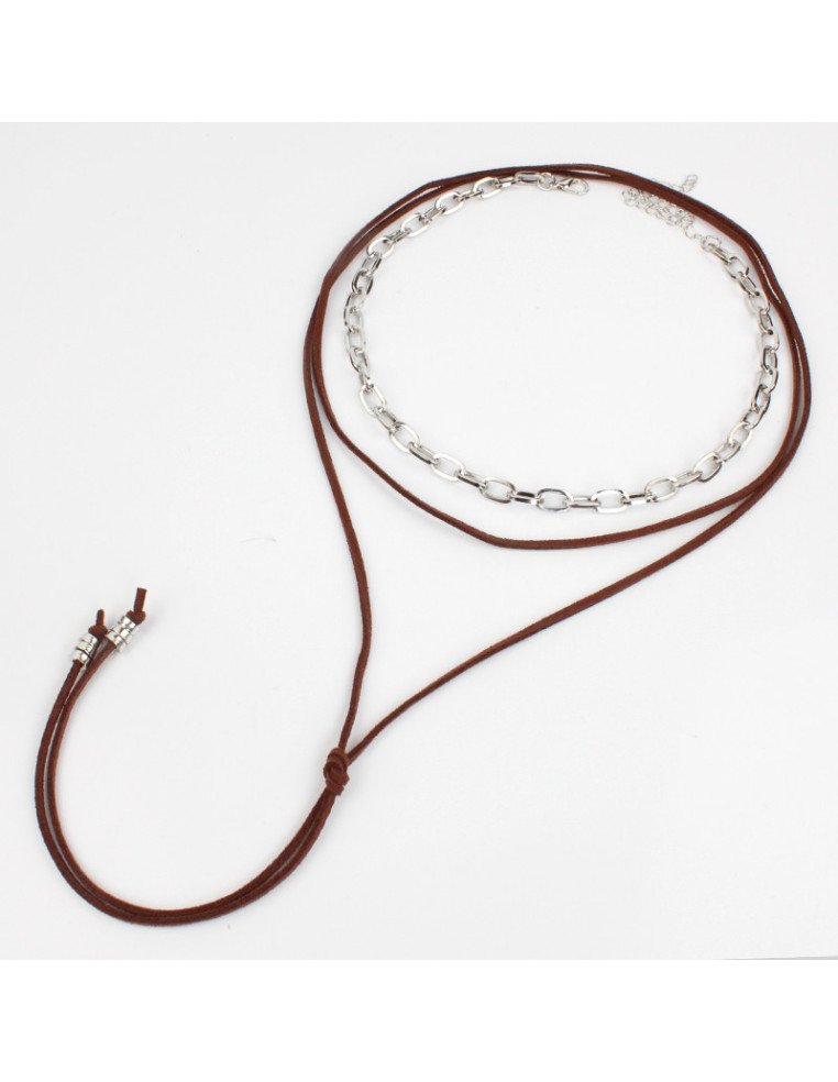 Set de dos collares, uno de cadena diferenciada otro de gamuza de múltiples vueltas y terminales en punteras.