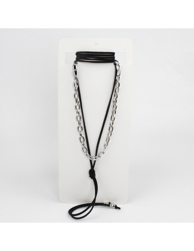 Set de dos collares, uno de cadena diferenciada otro de gamuza de múltiples vueltas y terminales en punteras.