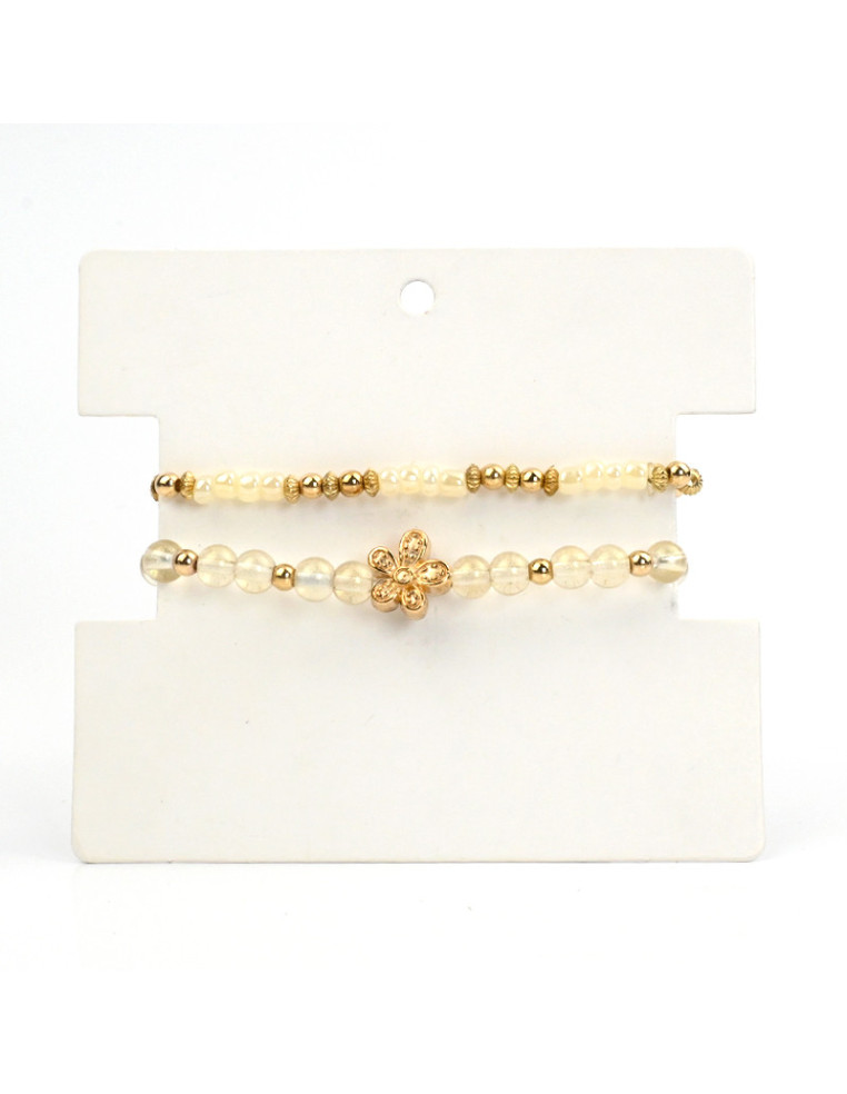 Set de dos pulseras elásticas de bolitas de vidrio, combinadas con mostacillas piezas pasantes de CCB y dije pasante con forma de flor.