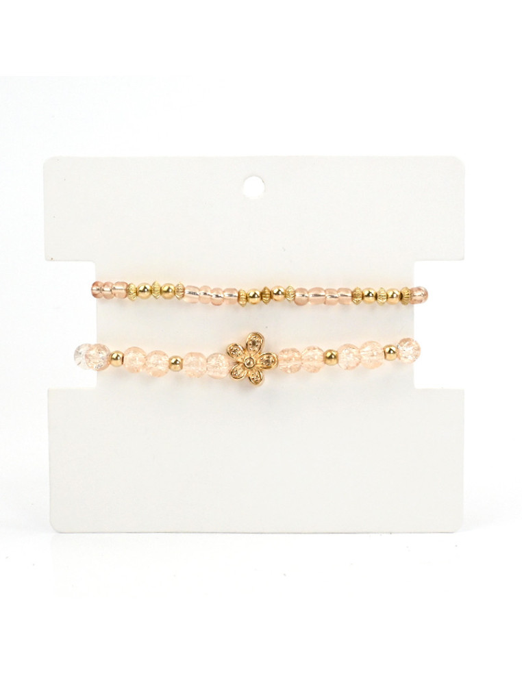 Set de dos pulseras elásticas de bolitas de vidrio, combinadas con mostacillas piezas pasantes de CCB y dije pasante con forma de flor.