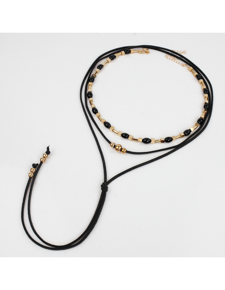 Medidas: collar de gamuza 140 cm de largo; collar flexible 35 cm de largo, diámetro ajustable con cadena de 10 cm.