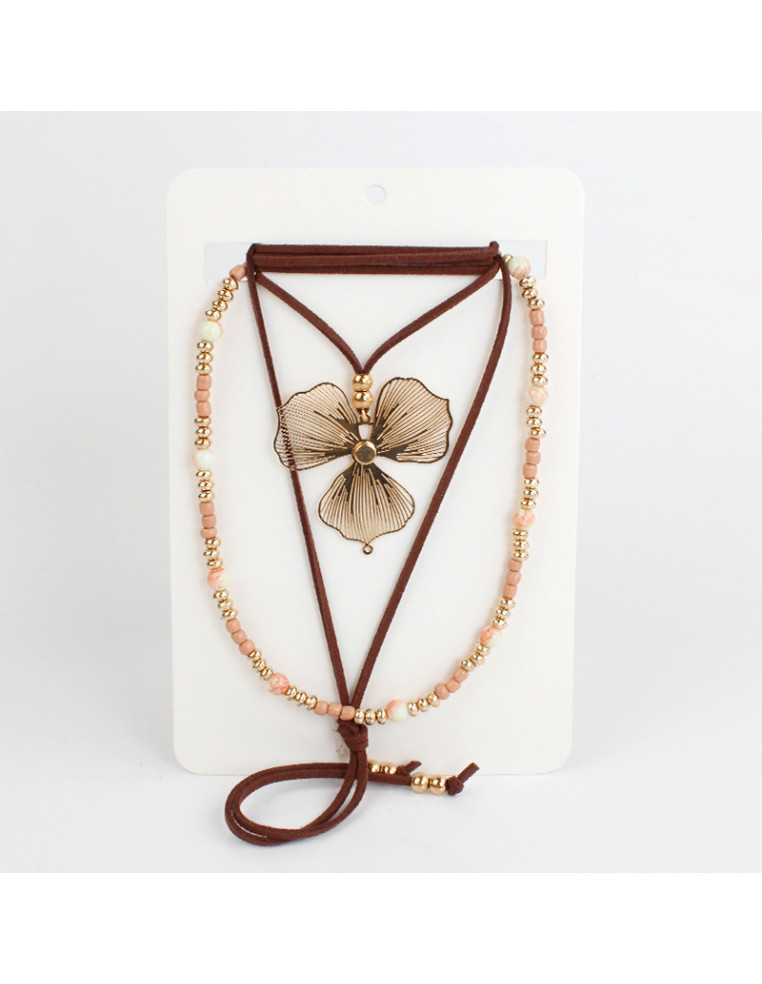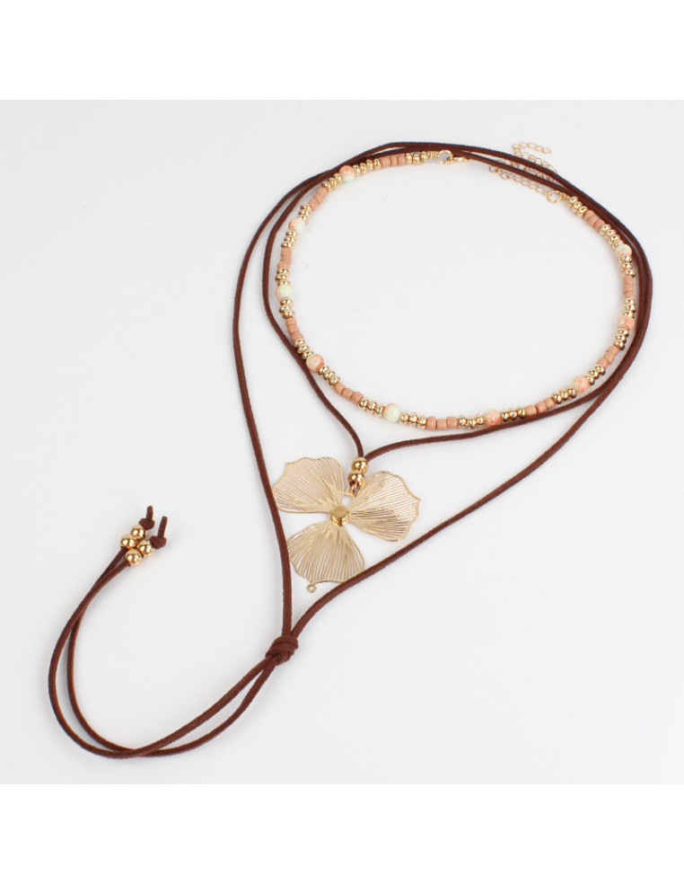 Set de dos collares, uno de gamuza con dije de metal con forma de flor, otro de lenga con bolitas de vidrio y mostacillas.