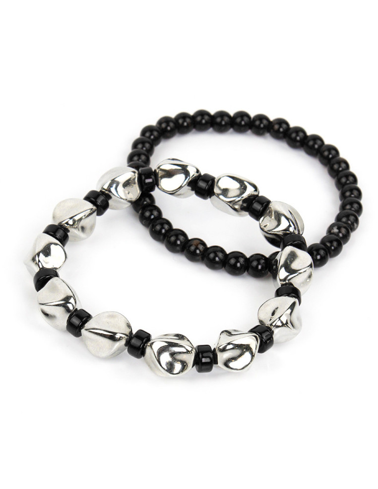 Set de dos pulseras elásticas, una de piezas de vidrio, combinada con pasantes orgánicos de CCB, otra de cuentas de vidrio.