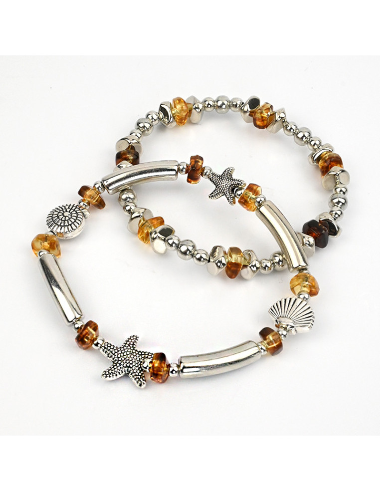 Set de dos pulseras elásticas de escallas de acrílico exclusivas combinadas con dijes pasantes veraniegos y separadores de CCB.