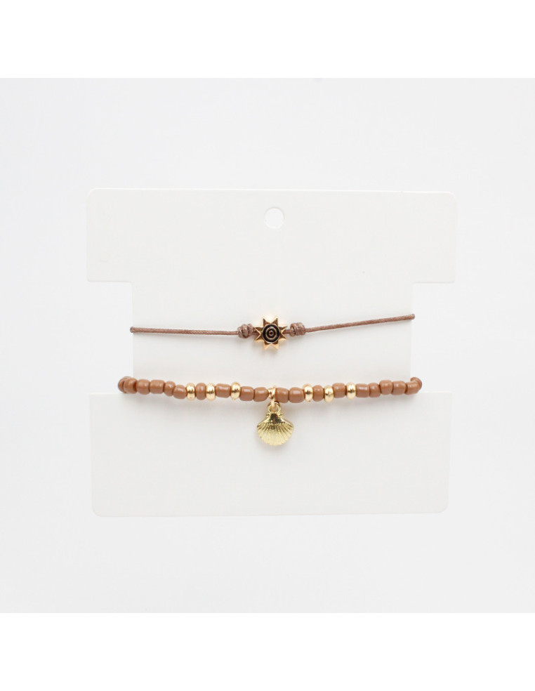 Set de dos pulseras, una de hilo con dije pasante, otra elástica de mostacillas, pasantes de CCB y dije marino de fundición.