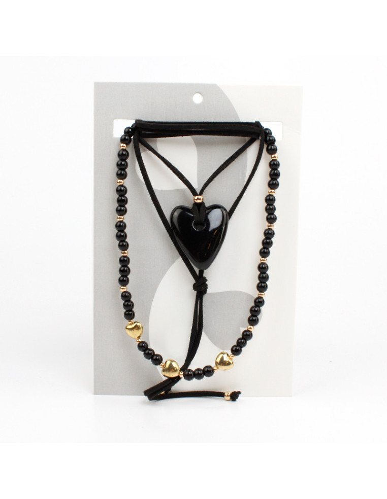 Set de dos collares, uno de gamuza de múltiples vueltas con dije de acrílico, otro de lenga con bolitas de vidrio, dijes pasantes con forma de corazon y pasantes de CCB.