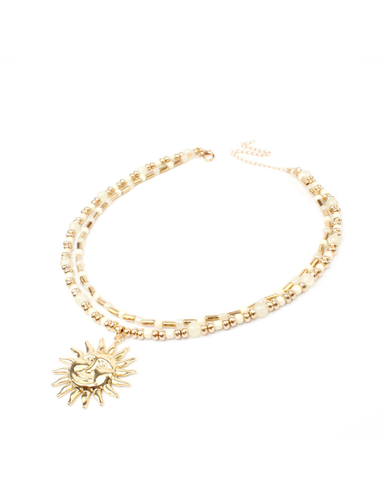 Collar flexible de lenga con mostacillas, bolitas de vidrio, pasantes de CCB y dije de fundición con forma de sol.