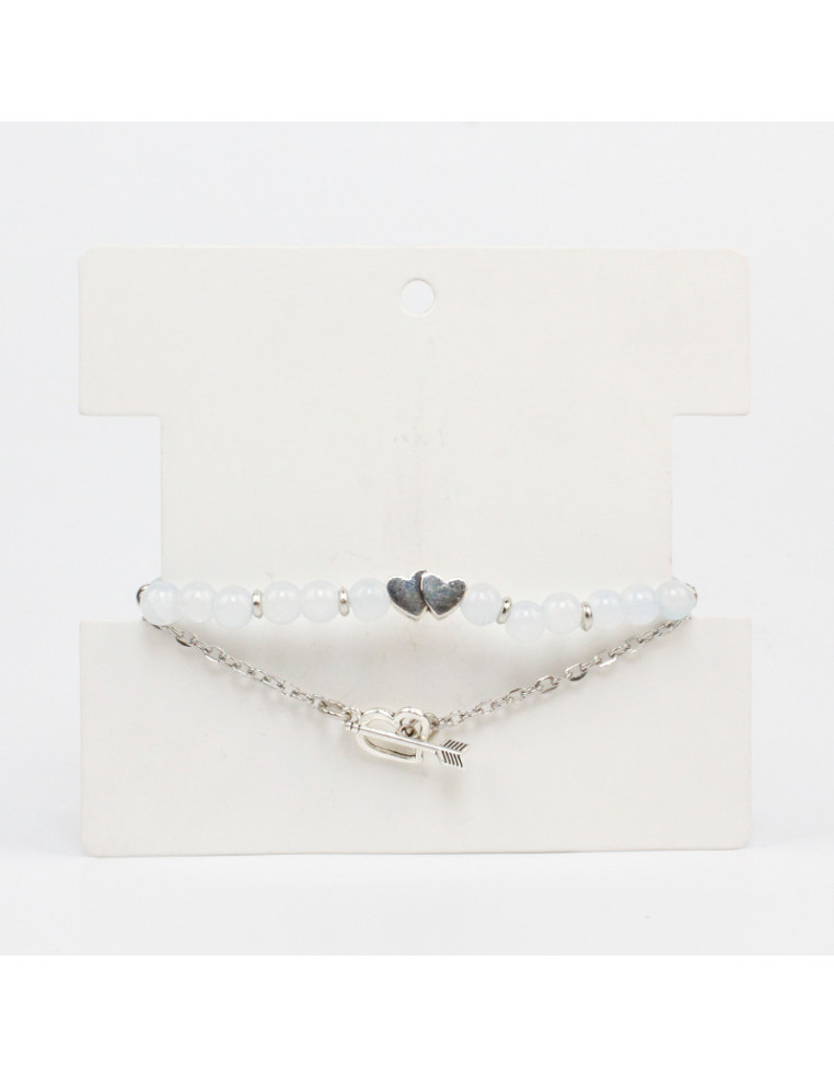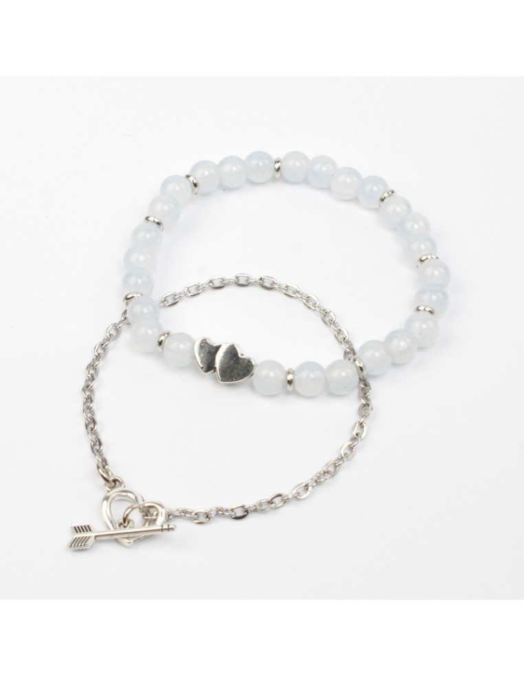 Set de dos pulseras, una elástica de bolitas de vidrio, con dije pasante con forma de corazones, otra de cadena con cierre marinero en forma de corazón.