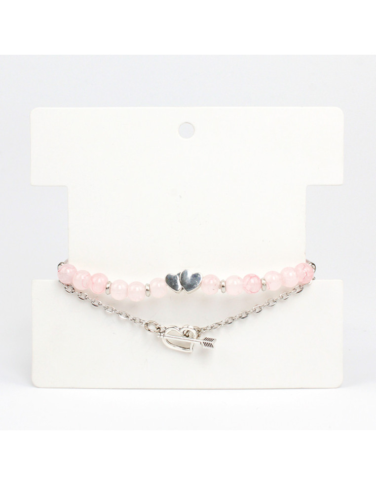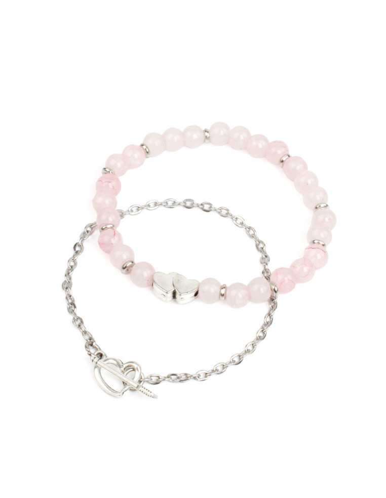 Set de dos pulseras, una elástica de bolitas de vidrio, con dije pasante con forma de corazones, otra de cadena con cierre marinero en forma de corazón.