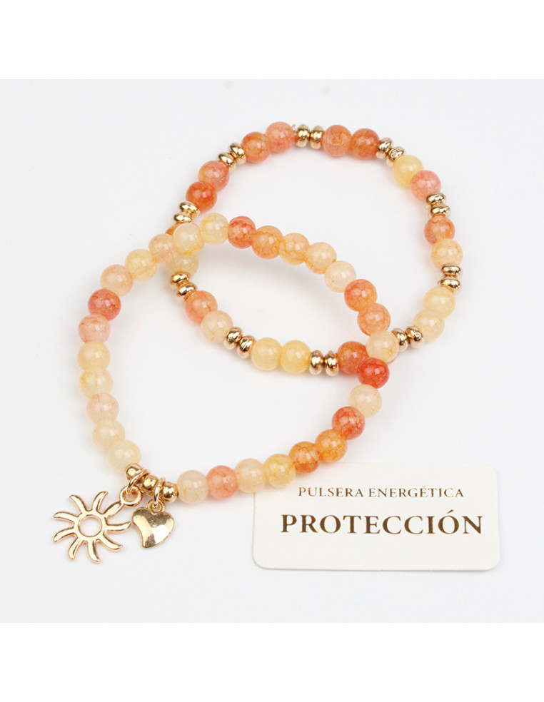 Set de dos pulseras elásticas de bolitas de vidrio energético, con pasantes de CCB y dijes de fundición.
