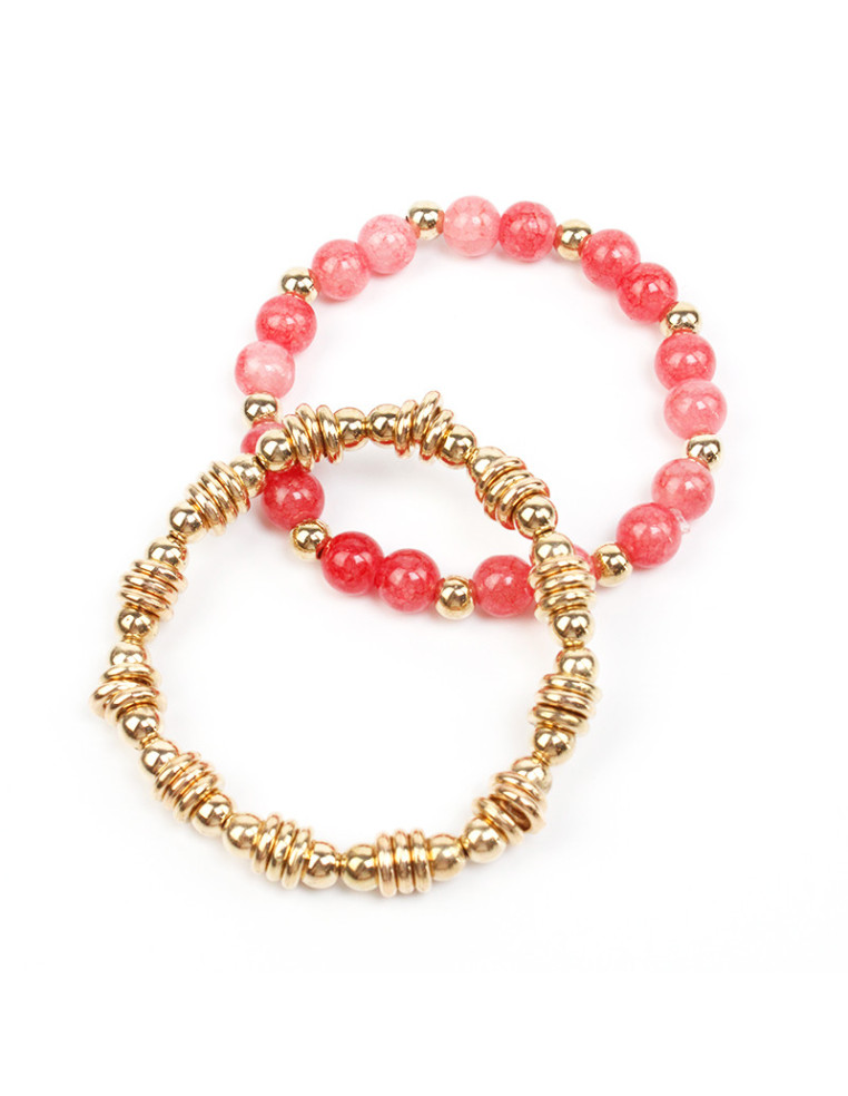 Set de dos pulseras elásticas, de bolitas de vidrio, y pasantes de CCB dorados.