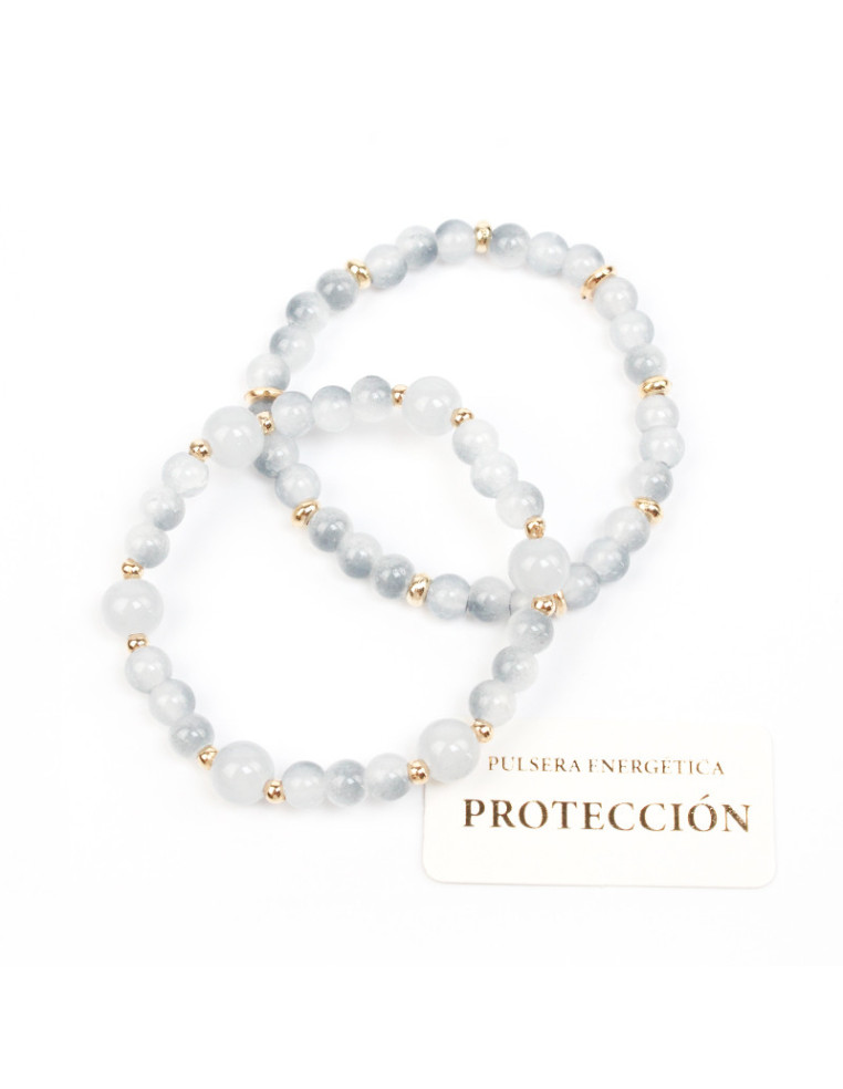 Set de dos pulseras de bolitas de vidrio energéticas con pasantes de CCB dorados.