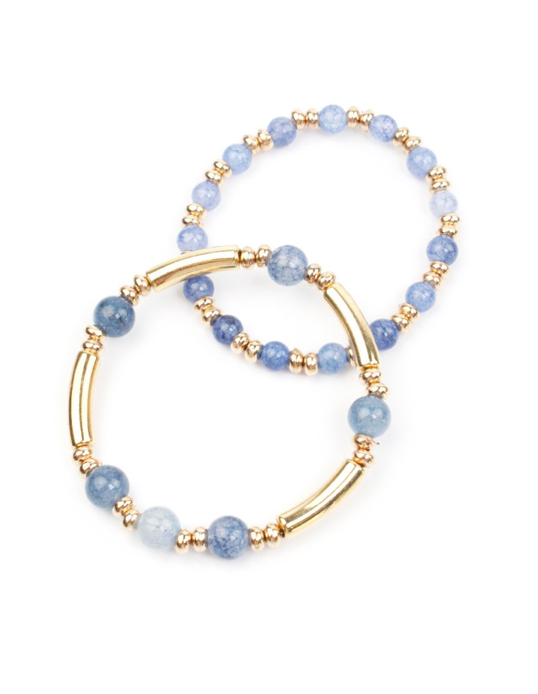 Set de dos pulseras elásticas de bolitas de vidrio, con tubos y pasantes de CCB dorados.