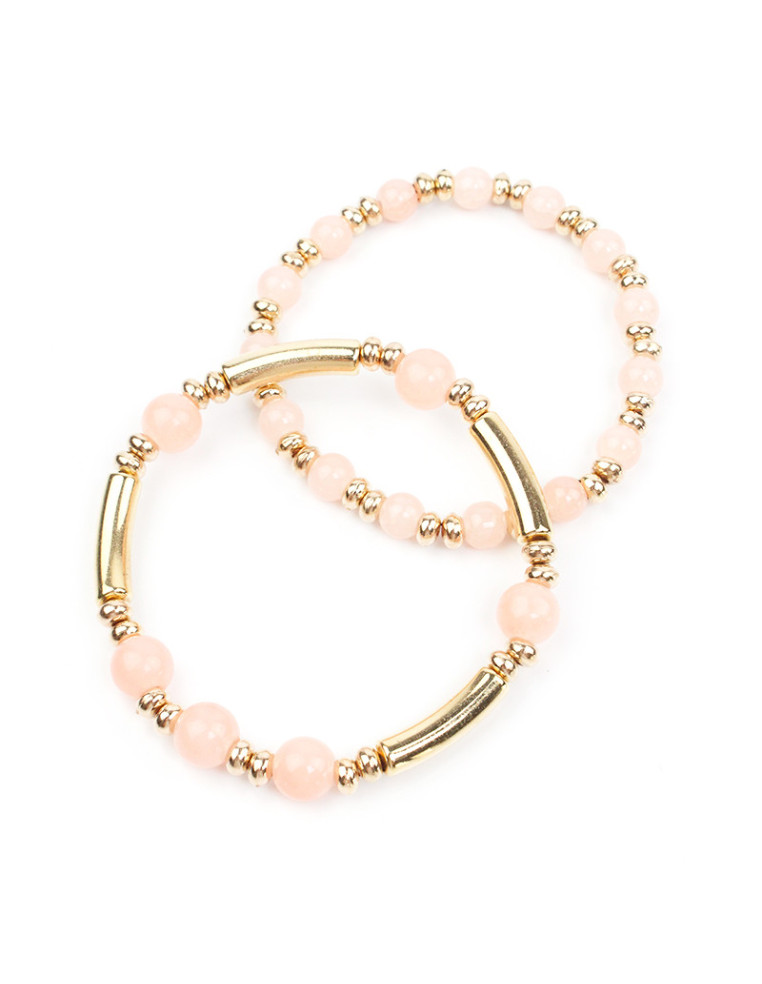 Set de dos pulseras elásticas de bolitas de vidrio, con tubos y pasantes de CCB dorados.