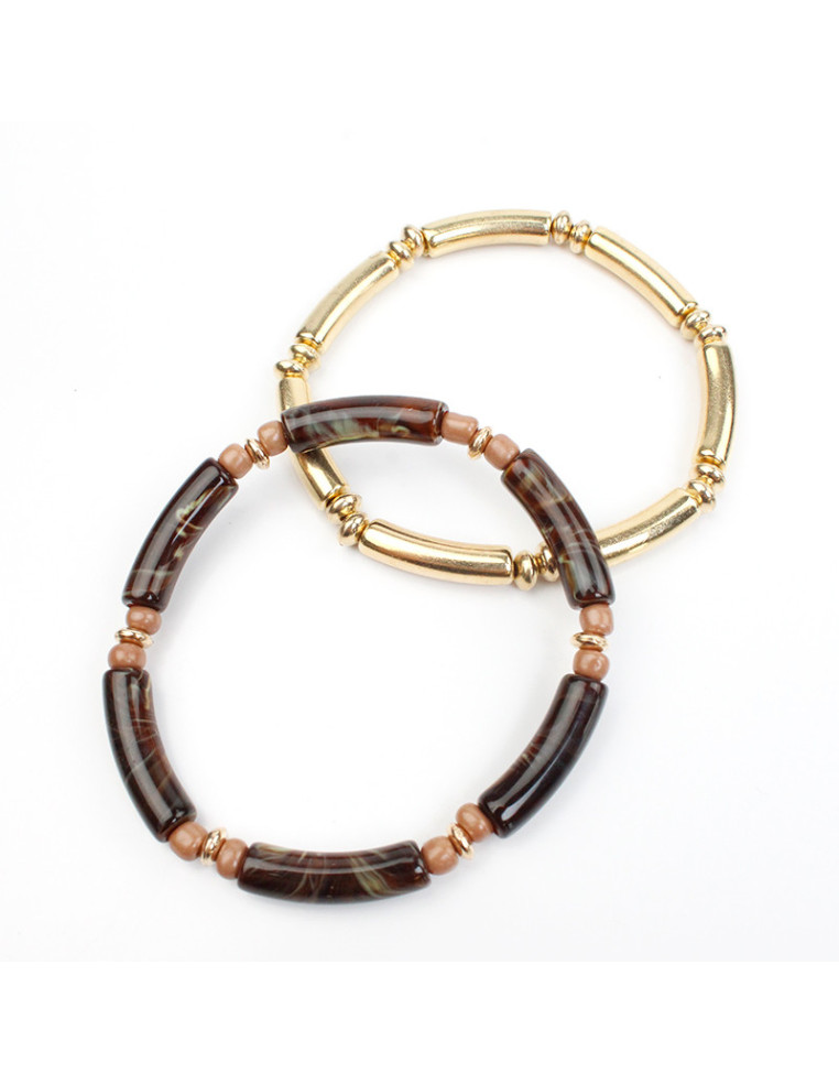 Set de dos pulseras elásticas, de tubos de acrílicos marmolados, con mostacillas y pasantes de CCB dorados.
