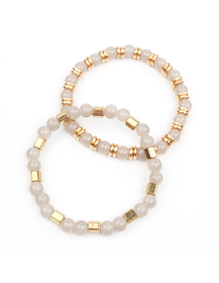 Set de dos pulseras elásticas de bolitas de vidrio marmoladas, con pasantes de CCB dorados.