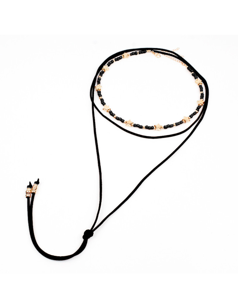 Set de collares, uno flexible de lenga, con mostacillas, dijes de estrellas pasantes de CCB dorados, otro de gamuza con múltiples vueltas.