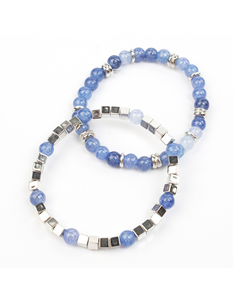 Set de dos pulseras elásticas de bolitas de vidrio, cubis y pasantes de CCB níquel.