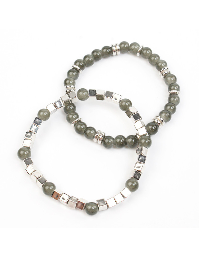 Set de dos pulseras elásticas de bolitas de vidrio, cubis y pasantes de CCB níquel.
