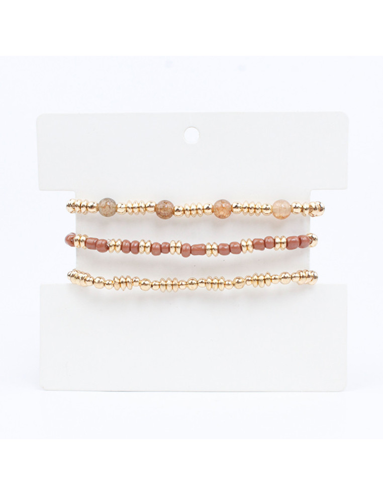 Set de tres pulseras elásticas de bolitas de vidrio, mostacillas y pasantes de CCB dorados.