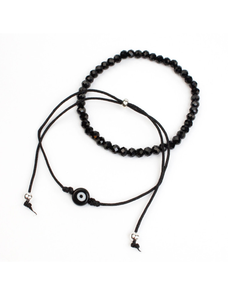 Set de dos pulseras, una elástica de rocas de cristal, otra de hilo con ojo de vidrio pasante.