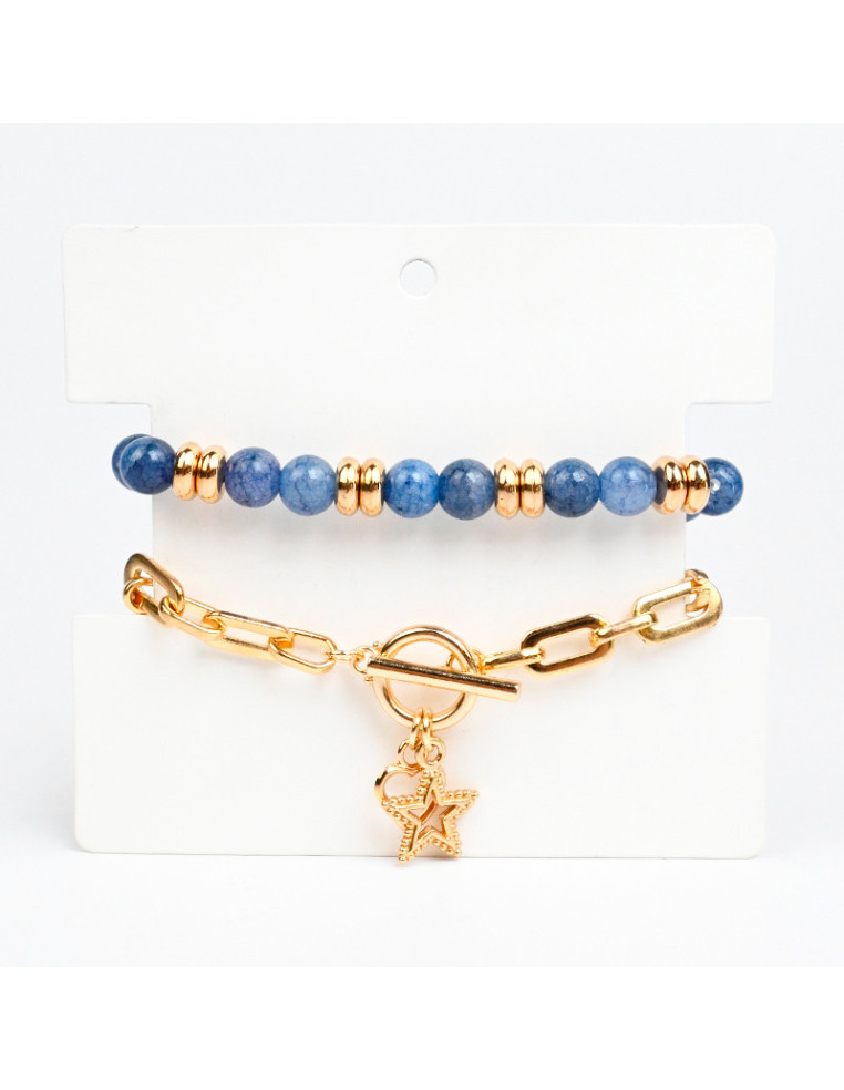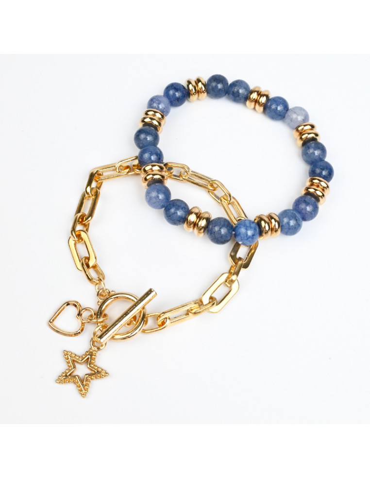 Set de dos pulseras, una elástica de bolitas de vidrio con pasantes de CCB y otra de cadena con dijes de fundición y cierre marinero.