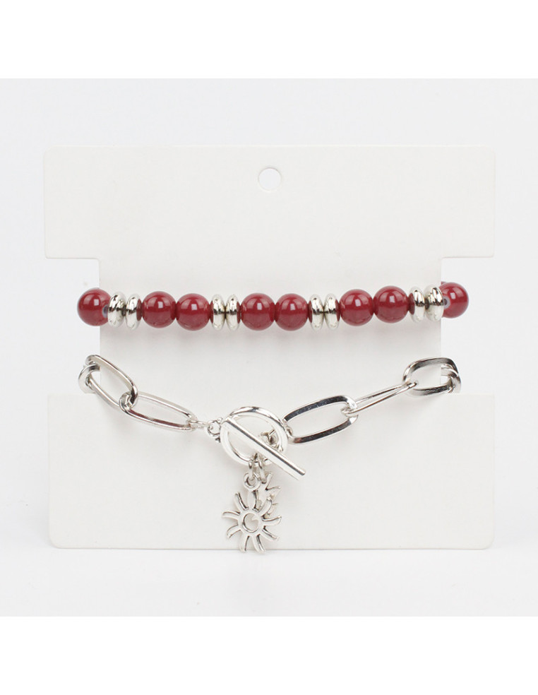 Set de dos pulseras, una elástica de bolitas de vidrio y pasantes de CCB, otro de cadena y cierre marinero.