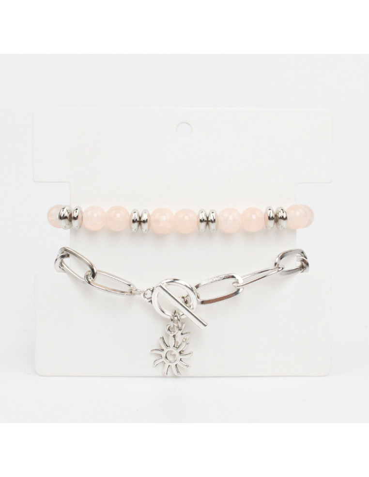 Set de dos pulseras, una elástica de bolitas de vidrio y pasantes de CCB, otro de cadena y cierre marinero.