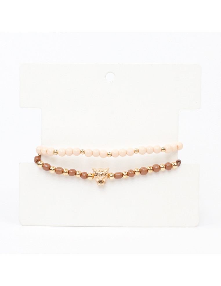 Set de dos pulseras, una elástica de bolitas de vidrio y pasantes de CCB. Otra de hilo con mostacillas, pasantes de CCB dorados y dije de fundición con forma de pantera.