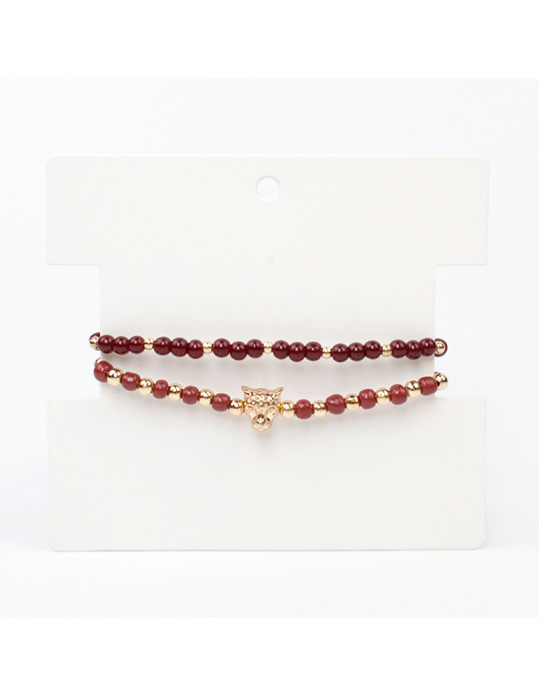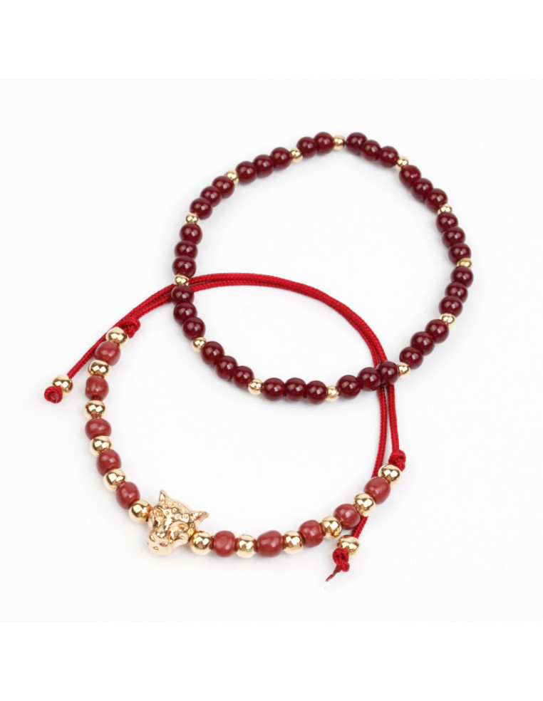 Set de dos pulseras, una elástica de bolitas de vidrio y pasantes de CCB. Otra de hilo con mostacillas, pasantes de CCB dorados y dije de fundición con forma de pantera.