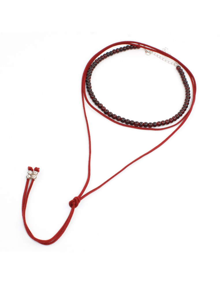 Set de dos collares, uno de lenga con bolitas de vidrio y otro de gamuza de múltiples vueltas y terminales en punteras.