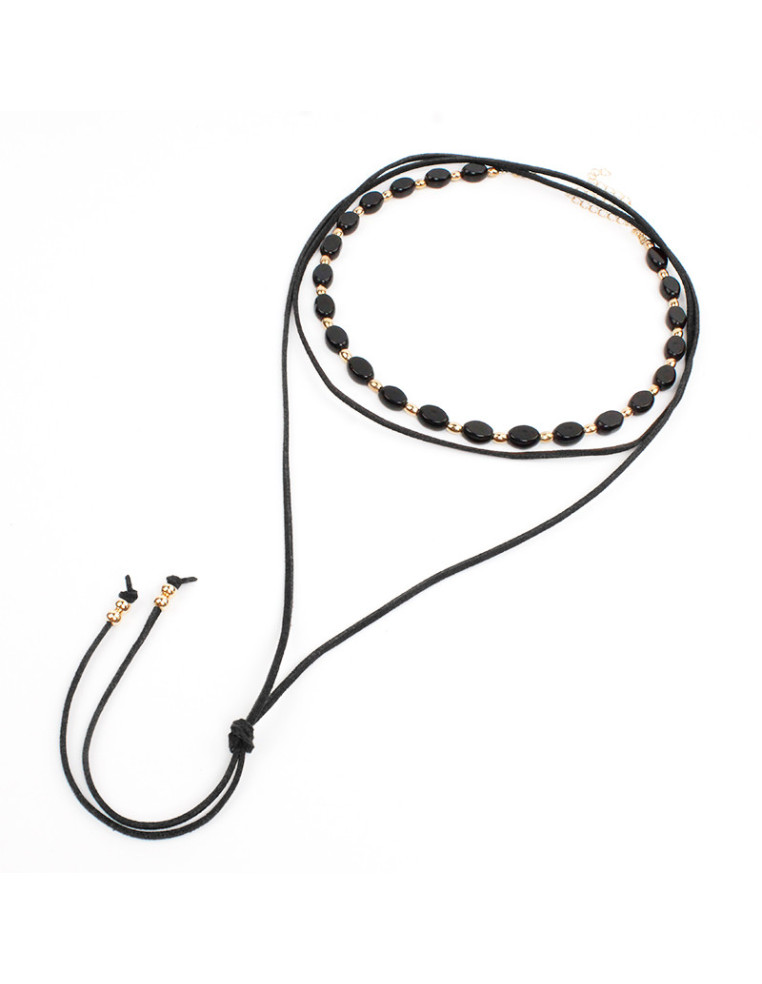 Set de dos collares, uno flexible de cuentas de vidrio ovales y pasantes de CCB, otro de gamuza de múltiples vueltas, con dije de y terminales en punteras.