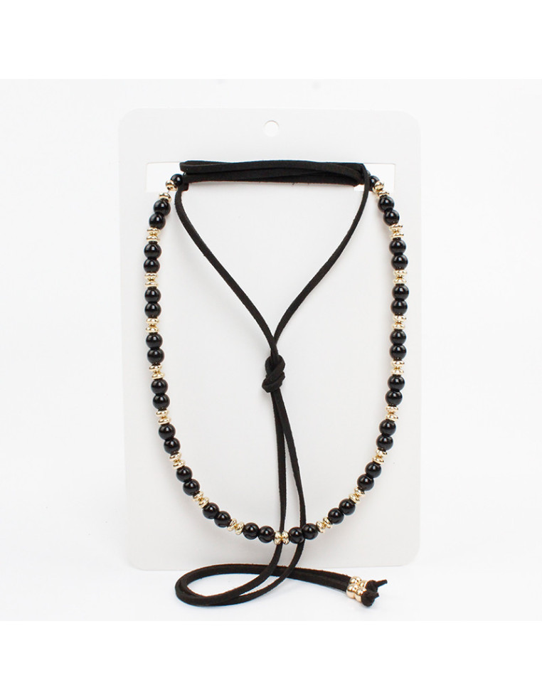 Set de dos collares, uno de lenga con bolitas de vidrio y pasantes de CCB, otro de gamuza con terminales en punteras.