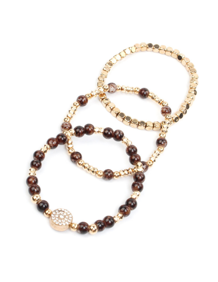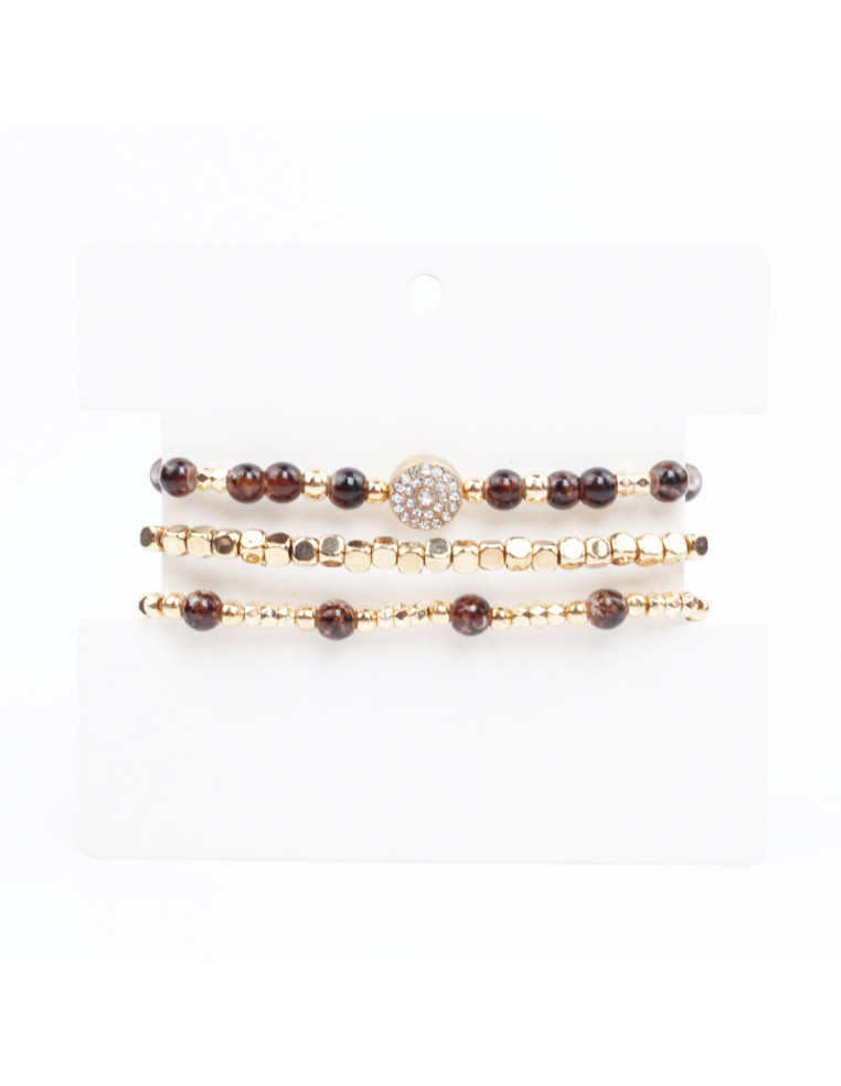 Set de tres pulseras elásticas de bolitas de vidrio, pasantes de CCB y dije de strass.