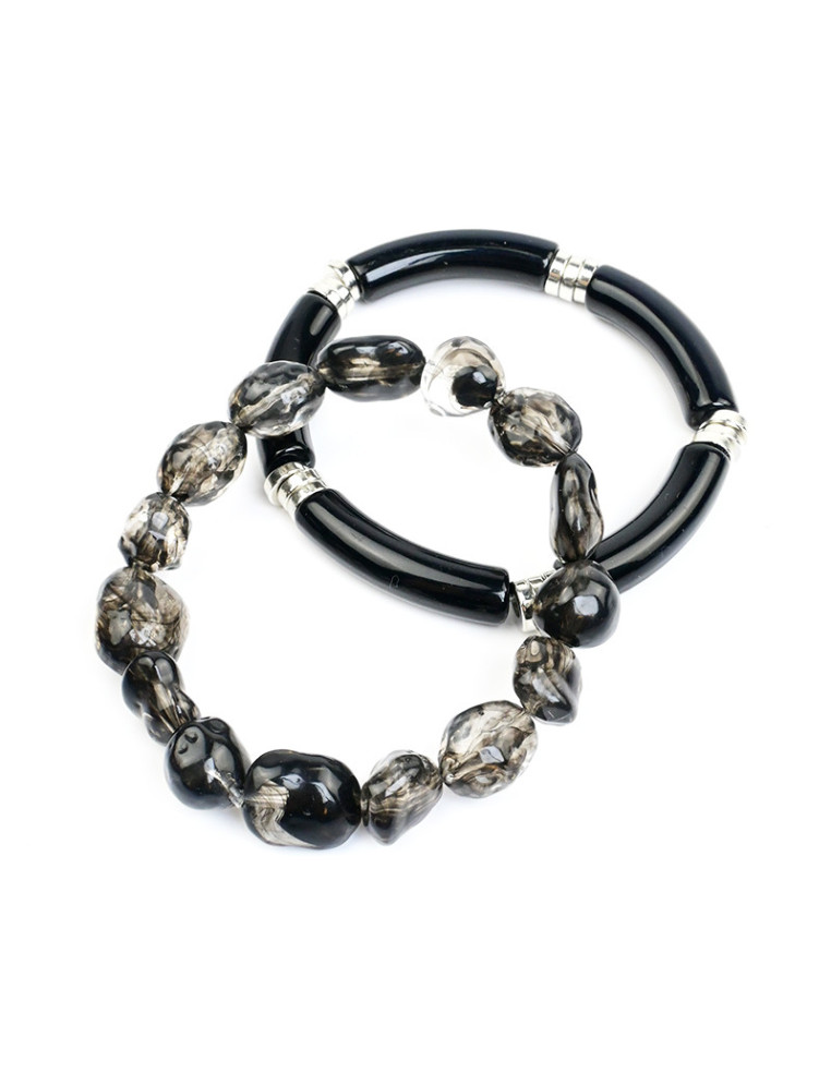 Set de dos pulseras elásticas de piezas de acrílico orgánicas y tubos marmolados.