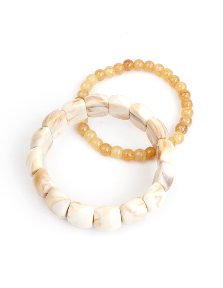 Set de dos pulseras elásticas de piezas de vidrio y acrílico diferenciado.