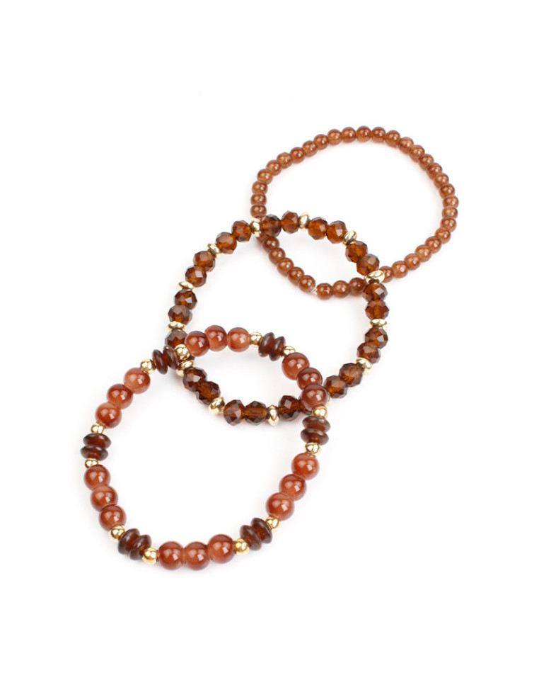 Set de tres pulseras elásticas de bolitas de vidrio, cuentas ovales de vidrio, rocas de cristal y pasantes de CCB dorados.