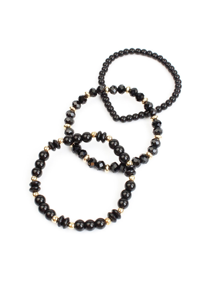 Set de tres pulseras elásticas de bolitas de vidrio, cuentas ovales de vidrio, rocas de cristal y pasantes de CCB dorados.