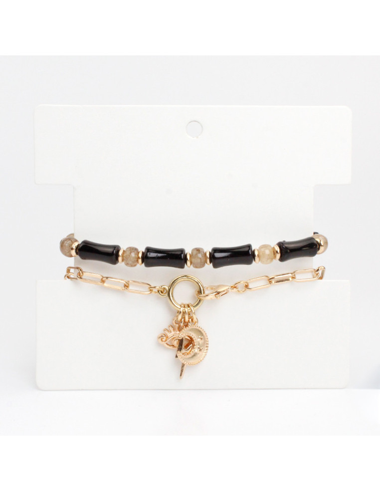 Set de dos pulseras, una elástica de cuentas de vidrio y pasantes de CCB, otra de cadena con dijes de fundición y cierre con nudo marinero.