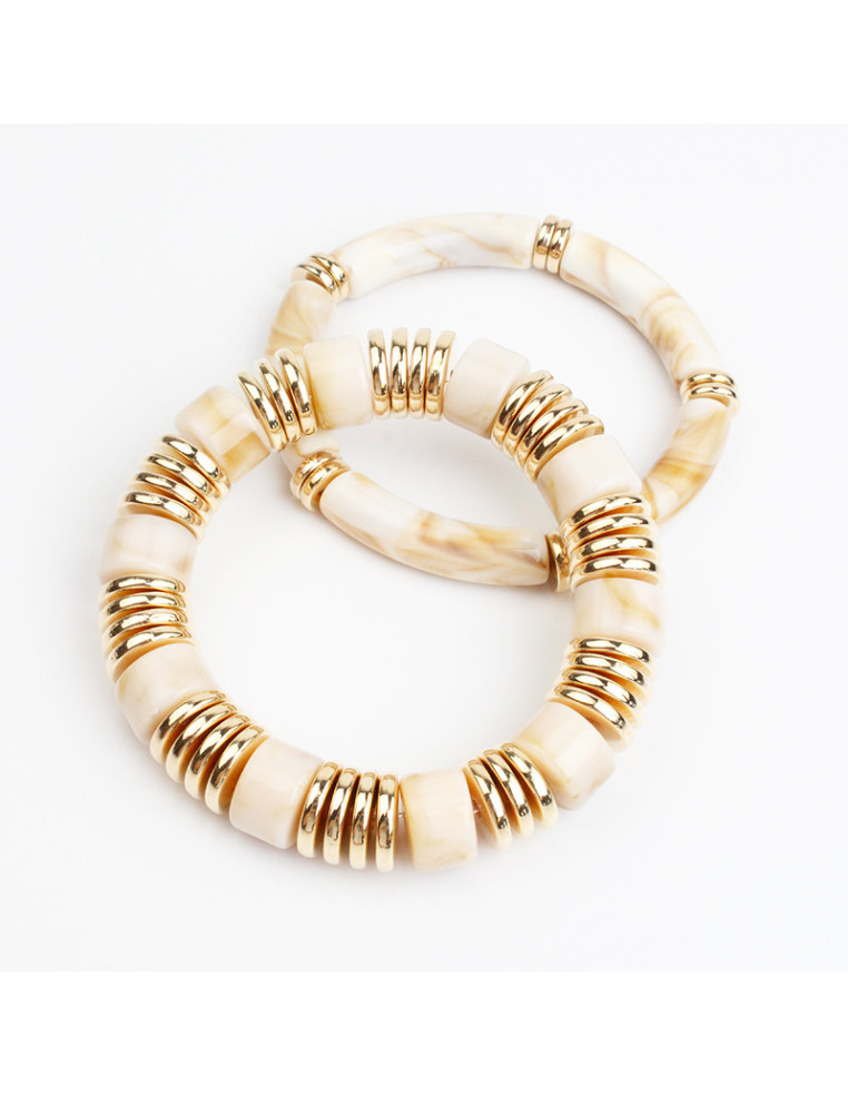 Set de dos pulseras elásticas de cuentas de acrílico y pasantes de CCB dorados.