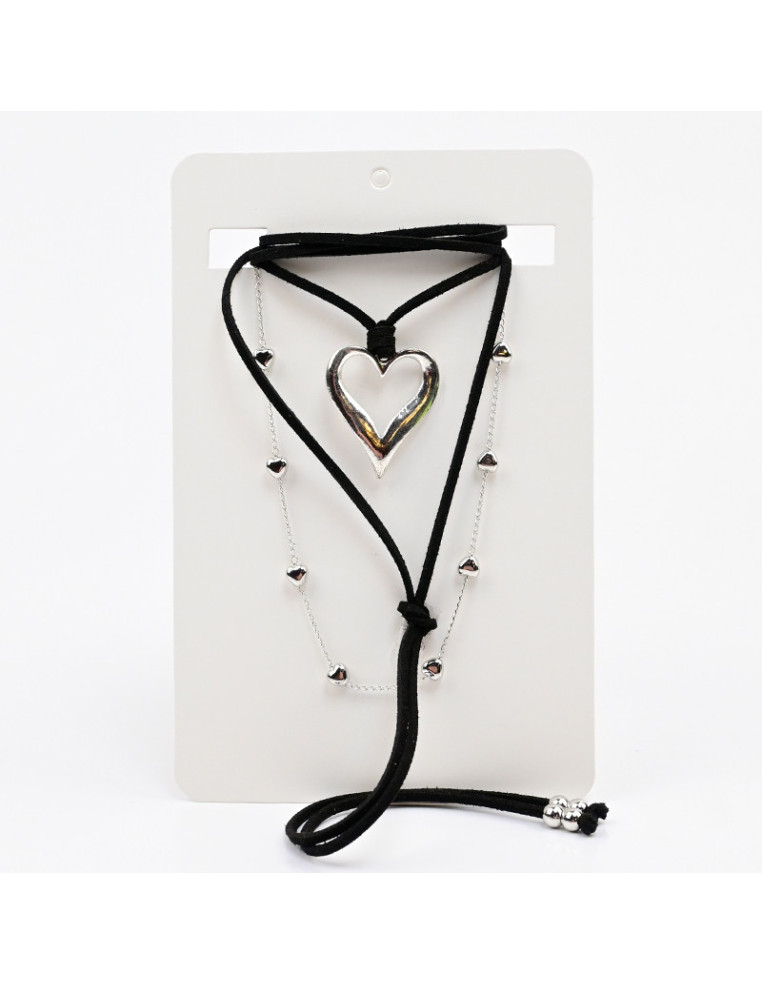 Set de dos collares, uno de cadena de eslabones con diseño de corazón, otro de gamuza con dije de fundición con forma de corazón.