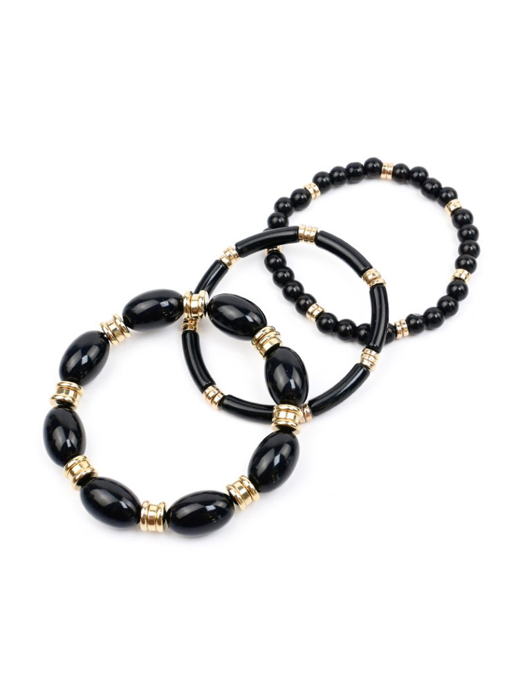 Set de tres pulsera elástica de bolitas de vidrio y cuentas acrílicas marmoladas.