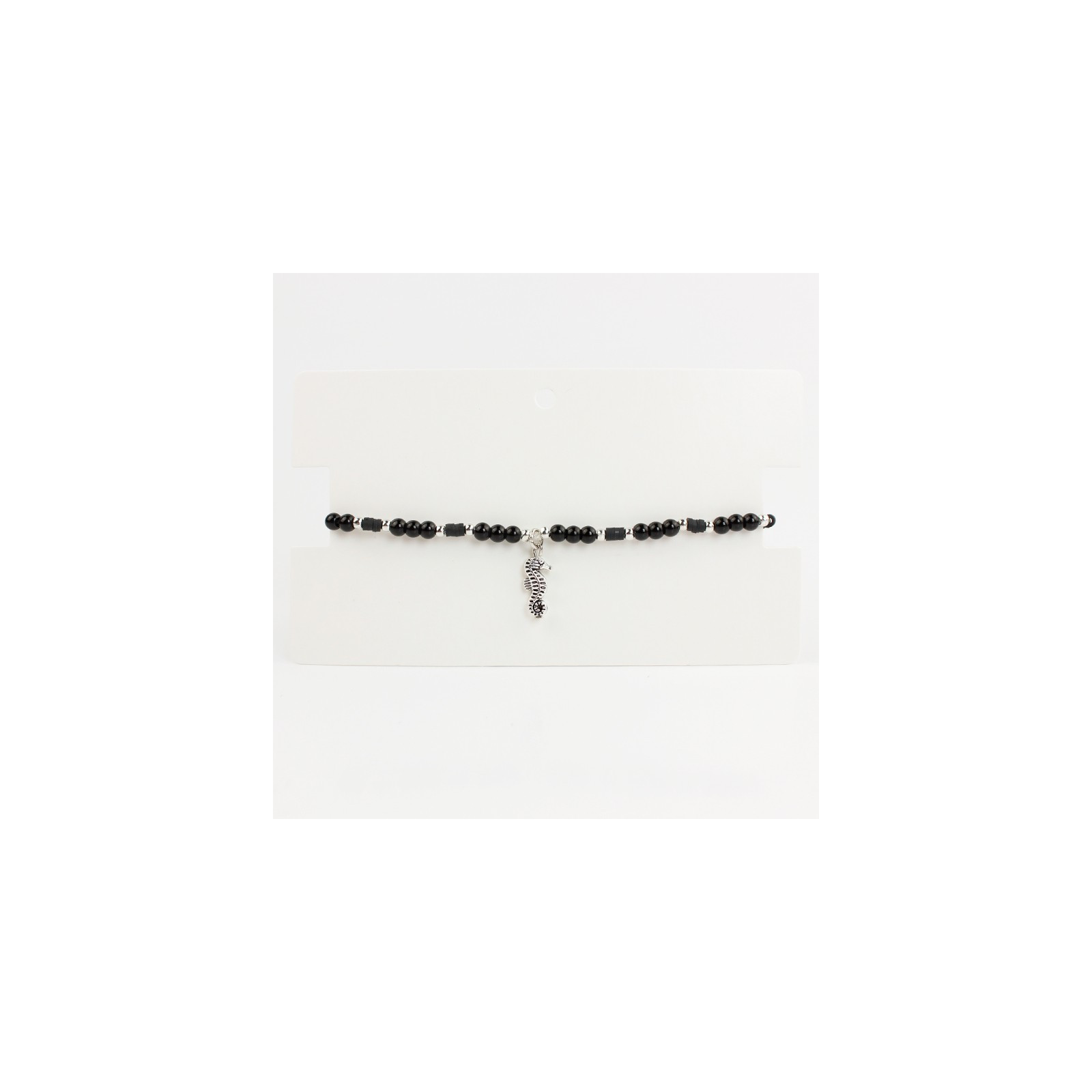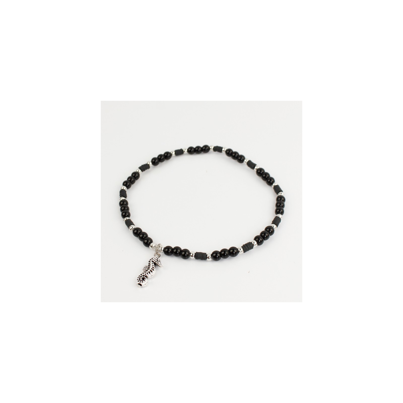 Tobillera flexible de bolitas de vidrio diferenciadas, combinadas con fimo, piezas pasantes de CCB y dije exclusivo de fundición con forma de caballo de mar.