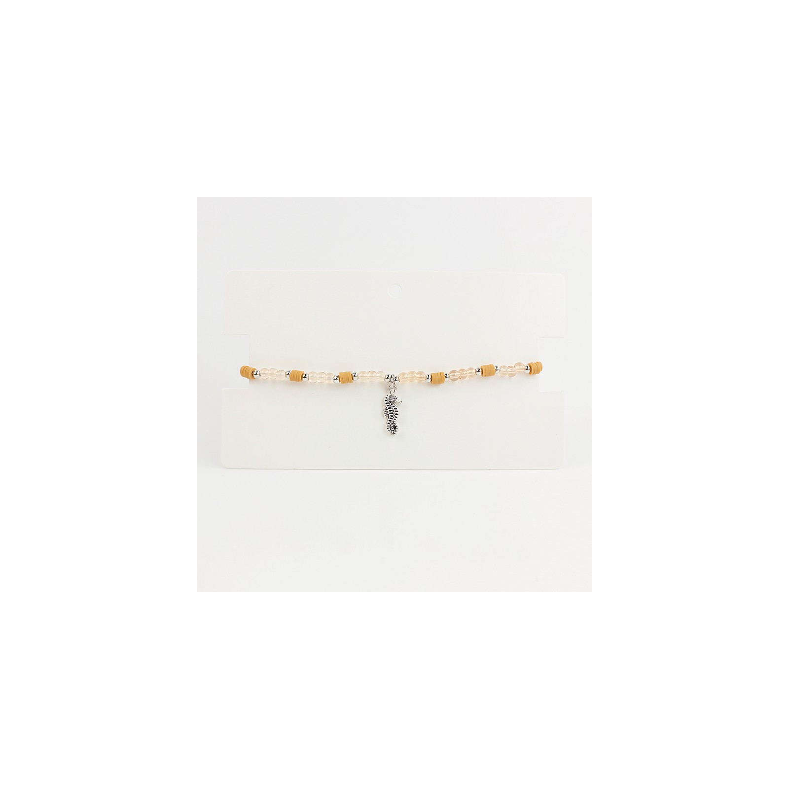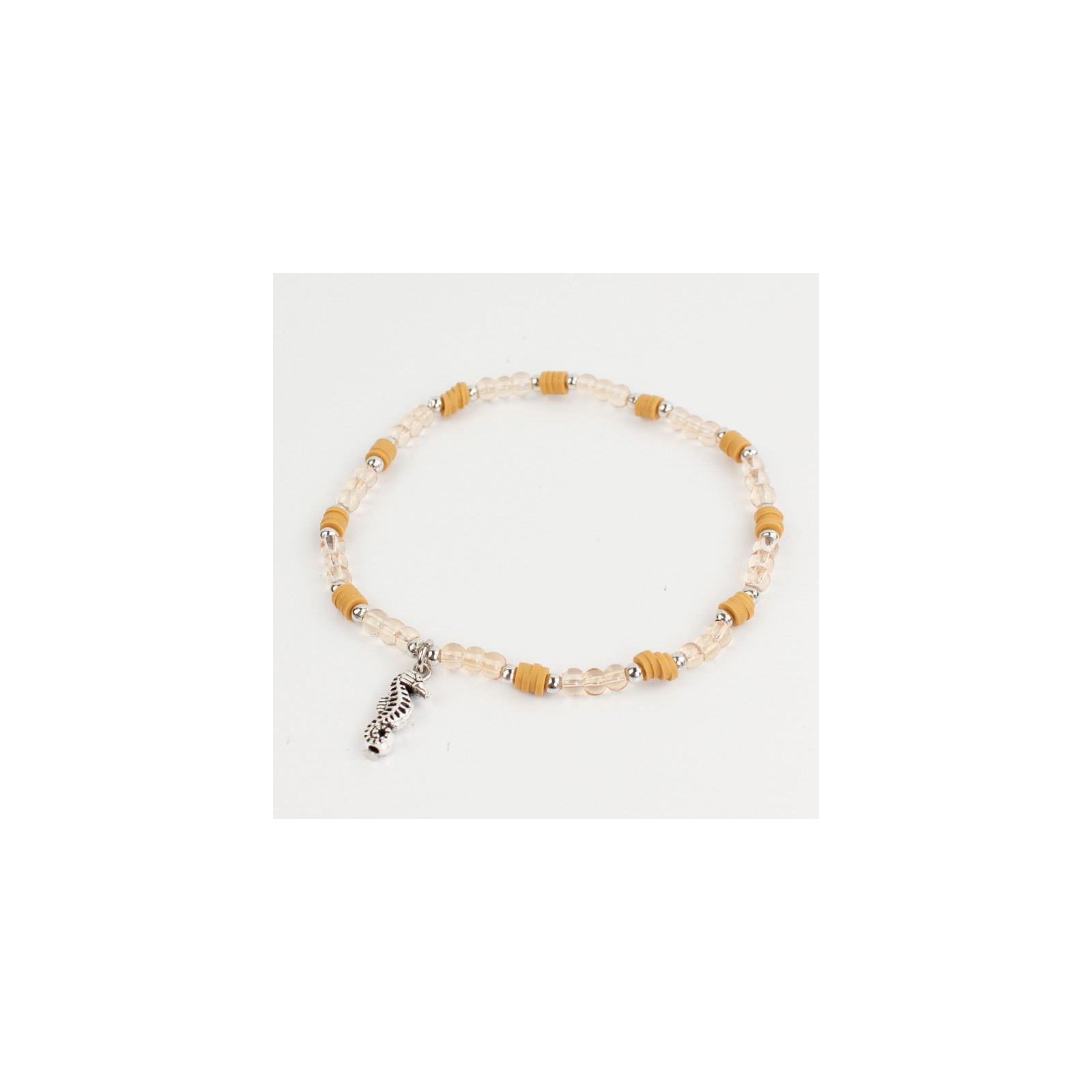 Tobillera flexible de bolitas de vidrio diferenciadas, combinadas con fimo, piezas pasantes de CCB y dije exclusivo de fundición con forma de caballo de mar.