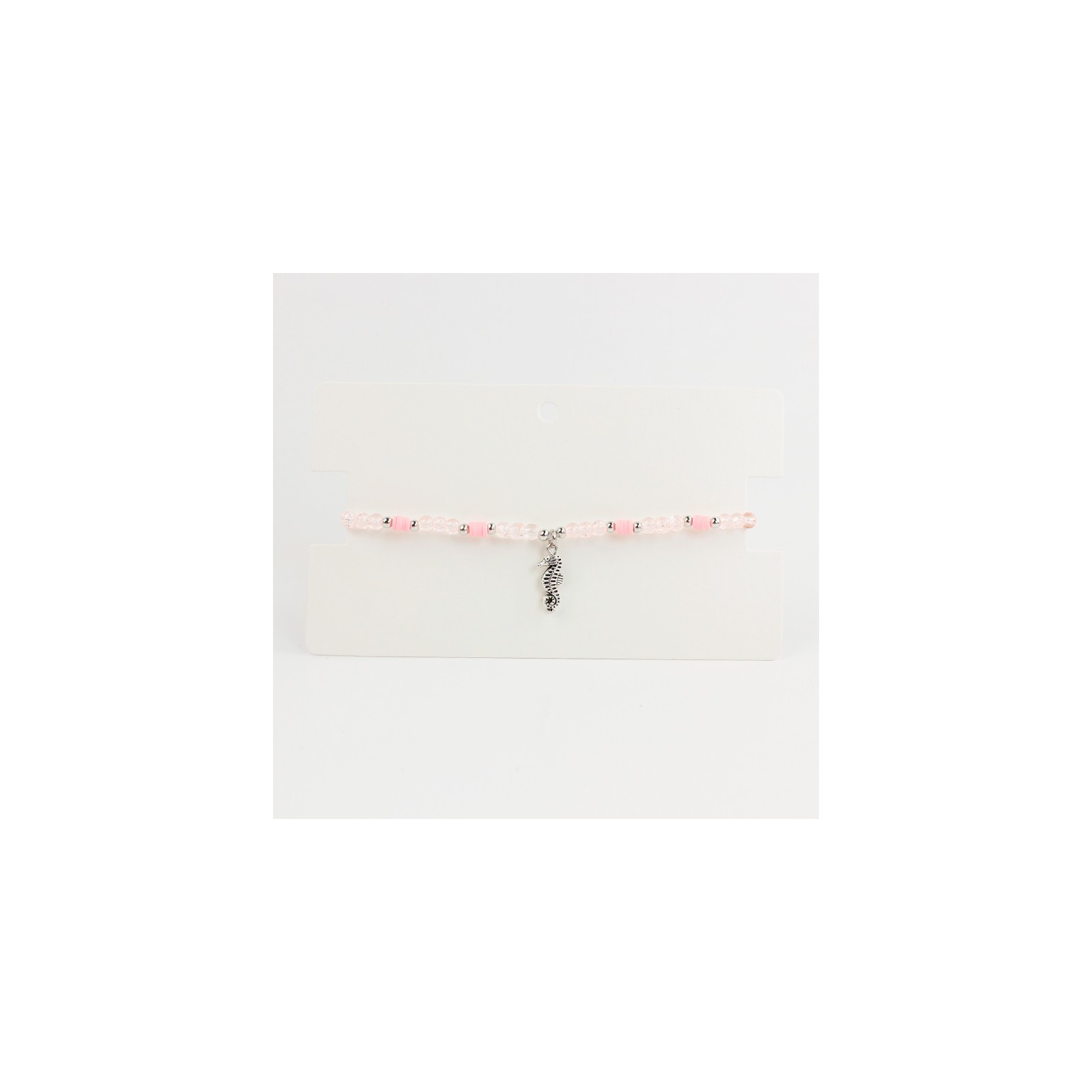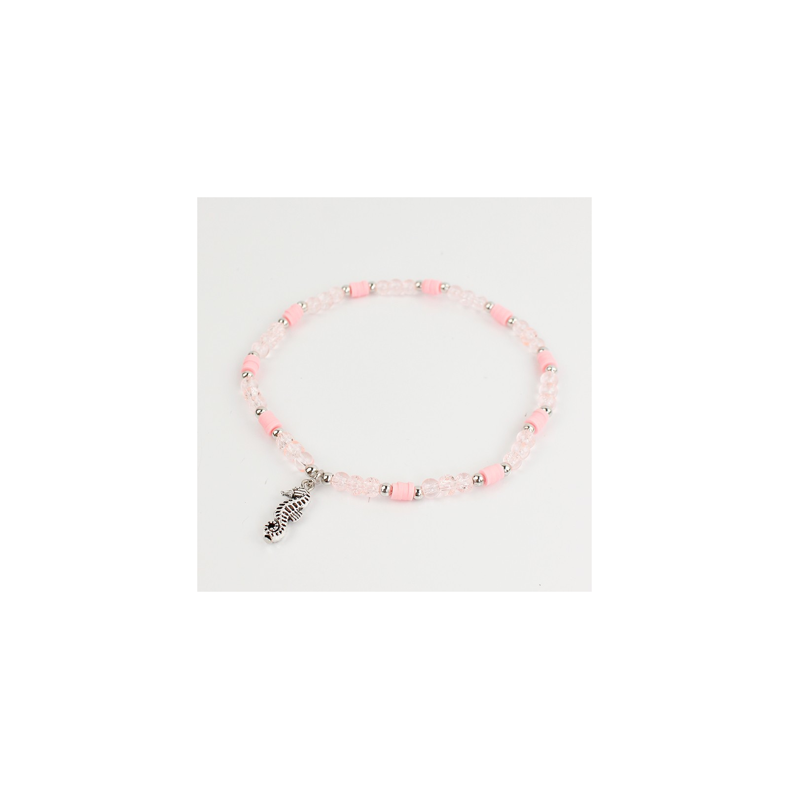Tobillera flexible de bolitas de vidrio diferenciadas, combinadas con fimo, piezas pasantes de CCB y dije exclusivo de fundición con forma de caballo de mar.